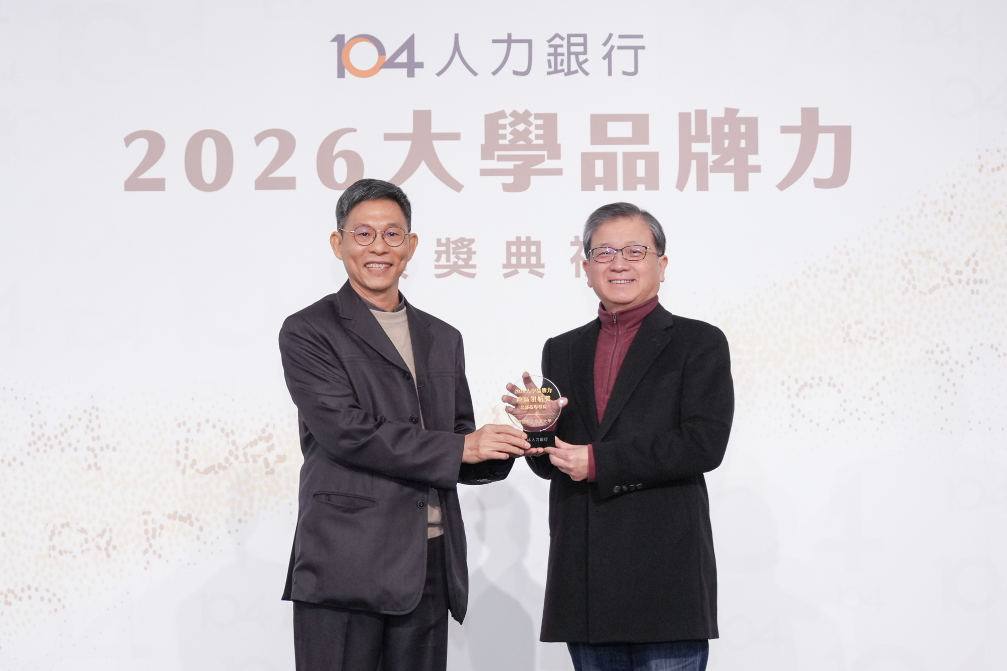 北商大勇奪104人力銀行2026年大學品牌力—「地區領航獎」,任立中校長親自出席領獎。